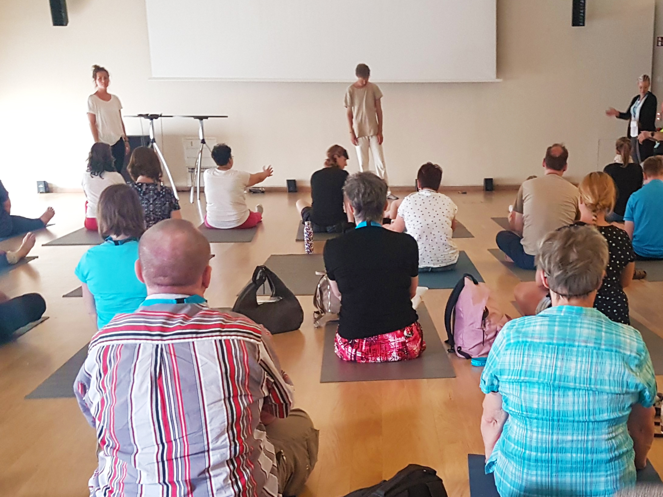 Auch für mich als erfahrene Yoga Praktizierende ist es jedes Mal faszinierend, wie die Atmosphäre im Raum sich während einer Stunde verändert. Meist gelingt es, die Welt „draußen“ für eine Weile zu vergessen, inne zu halten und zu spüren. Durch Tobias angenehme Präsenz und seine akzeptierende Haltung hat er es wunderbar vermocht, einem das Gefühl des Yoga „Du bist gut, so wie du bist“ zu vermitteln. Natürlich war das Ambiente eines Kongresses, die vielen Teilnehmerinnen und Teilnehmer und auch der Raum nicht optimal für eine tiefe Erfahrungen, aber Tobias konnte einen guten Eindruck vermitteln, was Yoga ist und kann. Nach der Stunde wurde er umringt und mit Fragen gelöchert, was zeigt, dass er etwas bewirkt hat.