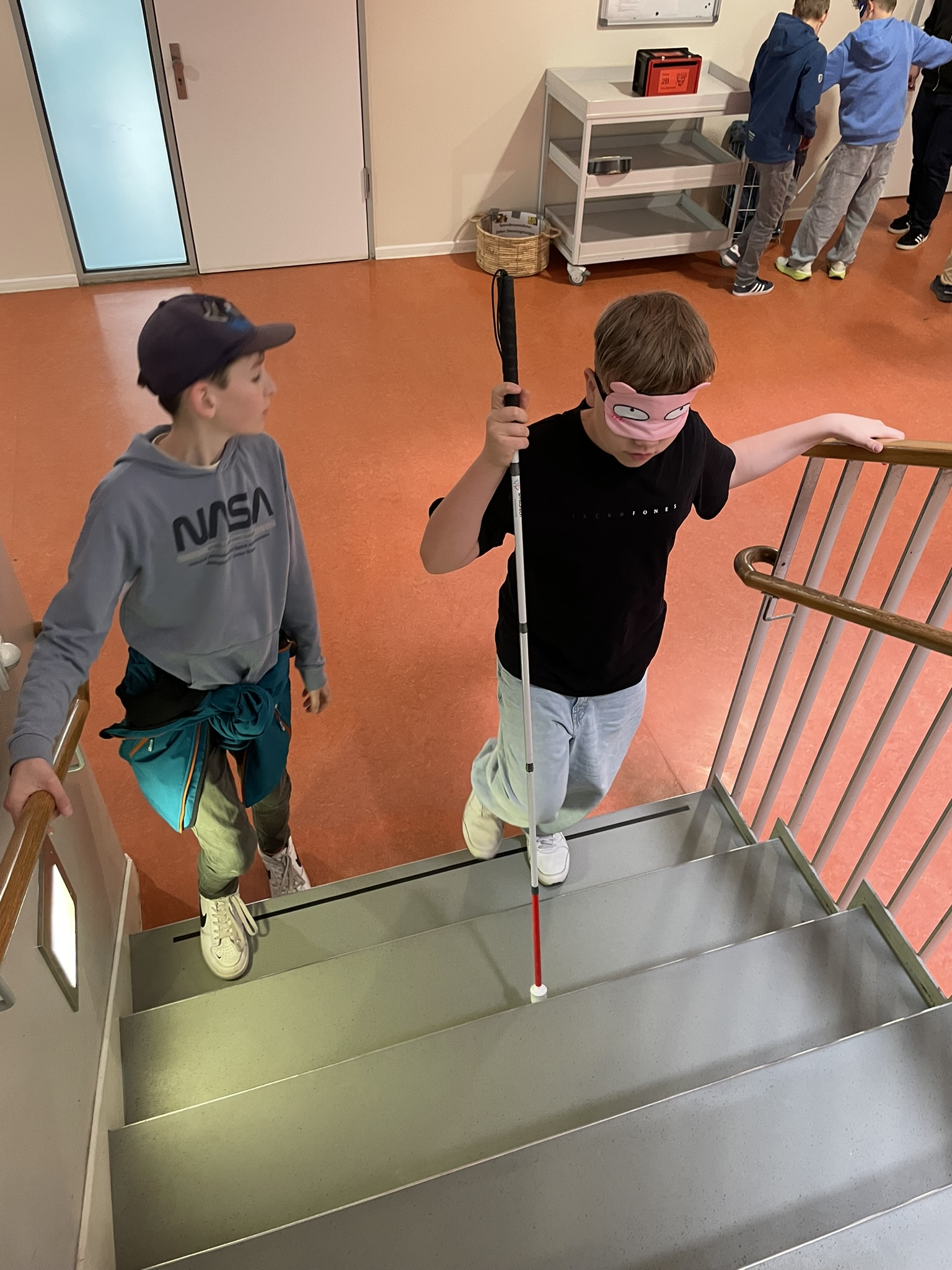 Zwei Jungen einer Grundschulklasse gehen eine Treppe hinauf. Einer der Jungen trägt eine Augenmaske und hat einen Blindenlangstock in der Hand. Er hält sich am Geländer fest, während er versucht blind die Treppe hinaufzusteigen. Der zweite sehende Junge steht neben ihm und passt auf den anderen jungen mit dem Blindenlangstock auf.