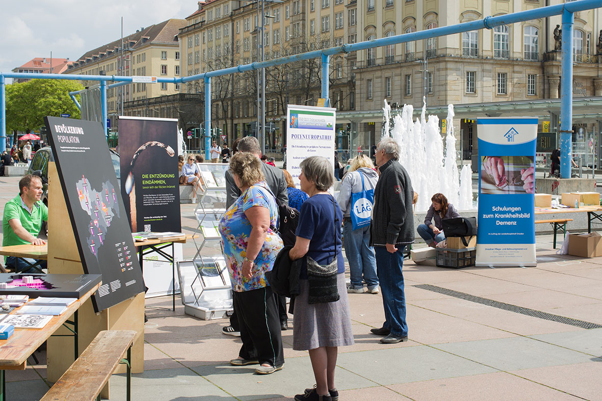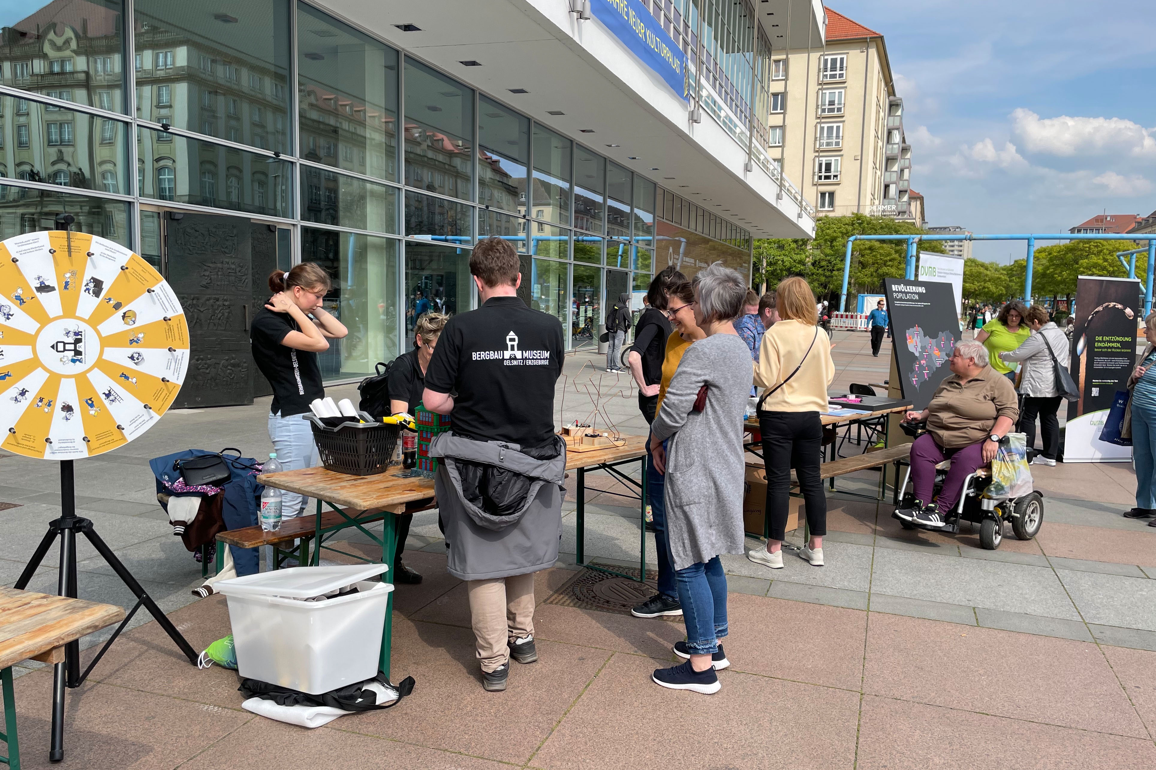 Der Landesverband Selbsthilfe Körperbehinderter Sachsen (LSKS) bot u. a. verschiedene Aktionen zum Thema Mobilität im öffentlichen Raum an. So konnten Besucher*innen beim Rollstuhl-Parcours und den angebotenen Rundgängen auf dem Dresdner Neumarkt selbst erfahren, wie schon kleinste alltägliche Hindernisse die Mobilität von Betroffenen wie Rollstuhlfahrern oder Blinden einschränken können.