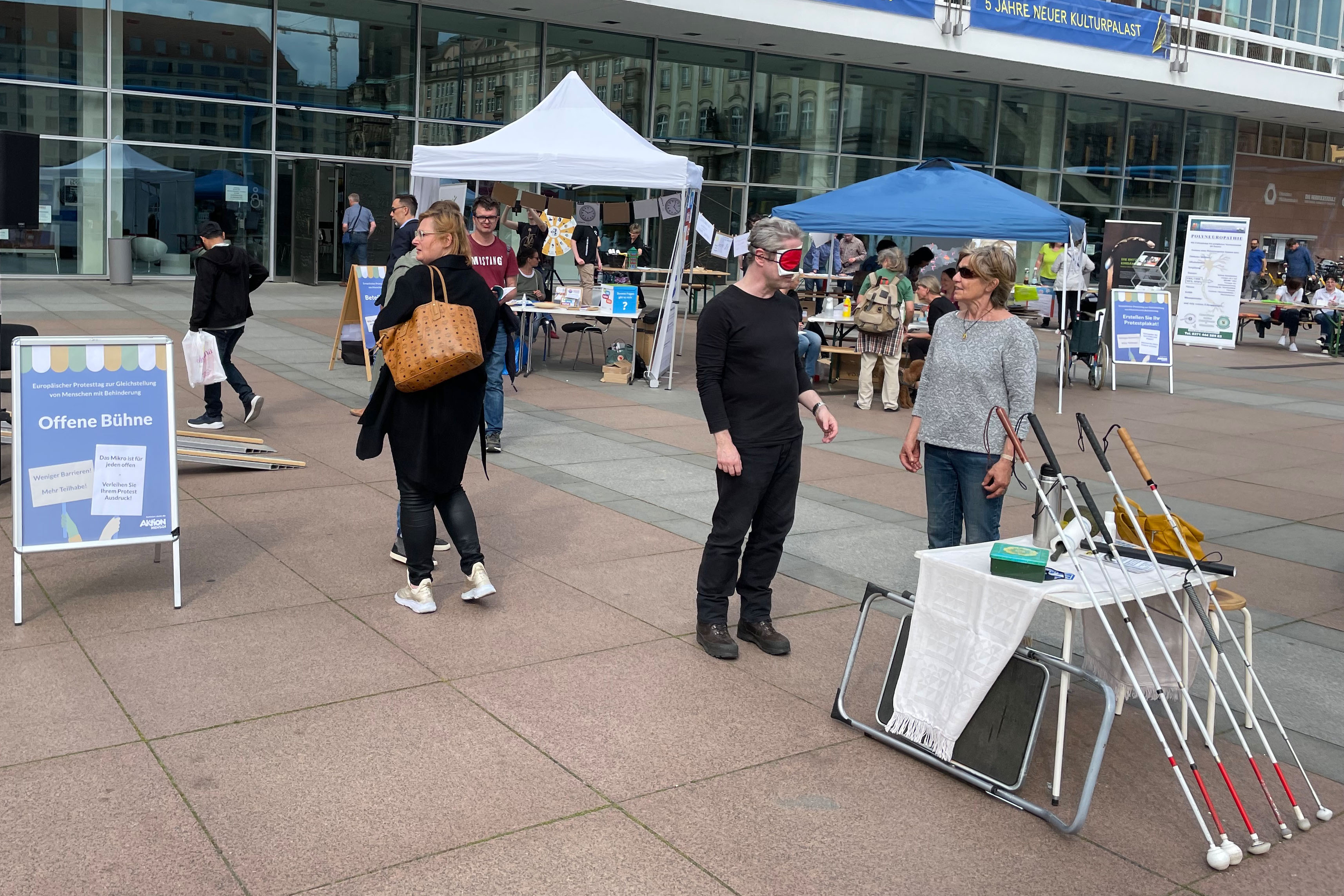 Anlässlich dieses Protesttages veranstaltete die Landesarbeitsgemeinschaft Selbsthilfe Sachsen gemeinsam mit vielen Partner*innen und dem Inklusionsnetzwerk Sachsen am 05. Mai 2022 den "Markt der Inklusion – weniger Barrieren, mehr Teilhabe" in Dresden. Vor dem Kulturpalast konnten Besucher*innen von 14 bis 17 Uhr bei schönstem Sonnenschein und Jazzklängen an zahlreichen Aktionen rund um Inklusion und Barrierefreiheit teilnehmen und sich an den Ständen der beteiligten Partner*innen zu diesen Themen informieren.