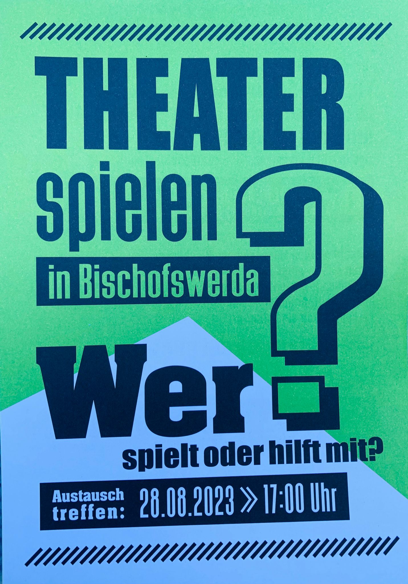 Alle, die Lust auf ein Theater-Gemeinschaftsprojekt in Bischofswerda in Kooperation mit Profi-Künstler*innen haben, sind herzlich eingeladen zum Austauschtreffen! Gesucht werden Menschen aus Bischofswerda und Umgebung - jeden Alters, jeder Herkunft, mit und ohne Behinderung: Darsteller*innen, Organisationstalente, Technikfreaks, Musiker*innen und alle, die sich mit ihrem Talent und ihren Ideen einbringen wollen.
