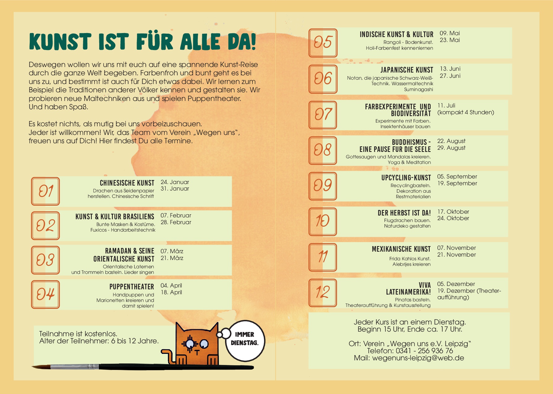 Im Jahr 2023 veranstaltet den Träger in seiner Außenstelle Leipzig das Projekt "Kunst ist für Alle da!" Das Projekt besteht aus einer Reihe von Workshops, die sich aus unterschiedlichen Themen in Verbindung mit Kunst und Kultur bilden. Die Inhalte werden pädagogisch begleitet und anhand von spielerischen Aktivitäten, Bastelaktionen, Vorträge über verschiedene Kulturfesten, sowie das Ausüben von Kunsttechniken, wie Malen, Zeichnen und Gestalten, und Kunstformen, wie Theater vermittelt. Das Projekt richtet sich an Kindern im Alter von 6 bis 12 Jahren mit und ohne körperliche, geistige &seelische Behinderung (Fokus auf seelischer Behinderung) und/oder Migrationshintergrund Durch das Projekt soll Inklusion und Integration gefördert werden. Wir glauben fest daran, dass alle Menschen unabhängig von ihren Voraussetzungen das Recht haben, an Kunst und Kultur teilhaben zu können.