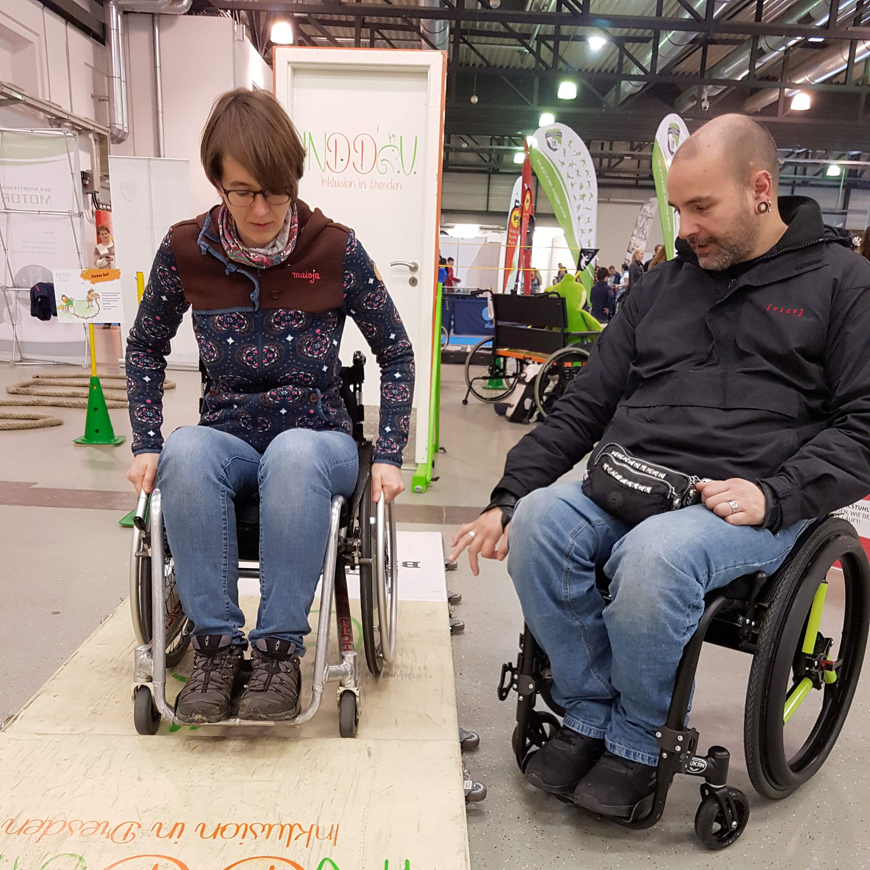 Die Schulen kommen auf mich zu für so einen Aktionstag, ich muss gar nichts machen. Ich bin mit meinem Parcours in verschiedenen Einrichtungen - Grundschule Gymnasium Universität ganz egal. Ich bin z.B. regelmäßig an der Carus Akademie und dort steht der Rollstuhl Parcours im Lehrplan. Ich bin dort regelmäßig als Dozent. In der Form ist das einzigartig in Deutschland.