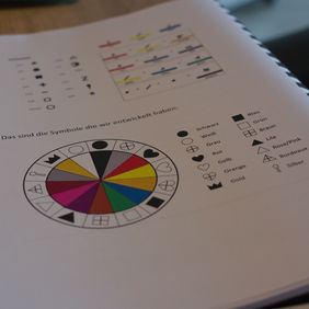 In der ersten Klasse war es in Mathe schwierig, weil es solche Ausmalbilder gab. Deshalb habe ich dann Stempel mit den Symbolen anfertigen lassen, um überall wo es um Farben ging, die Symbole drüber zu stempeln. Ich mache quasi immer die erste Schulwoche Urlaub, damit ich alles mit den Symbolen markieren kann. Es ist schon ein Aufwand, aber machbar und es ist eine Erleichterung für Helene.