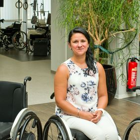 Zuerst war ich hier im Reha-Fachhandel auch nur Kundin. Ich bin zur Inkontinenz-Versorgung und anderen Hilfsmitteln beraten worden und da dachte ich, das würde doch auch optimal zu mir passen, da bewirbst du dich einfach mal. Für die Kunden ist es extrem angenehm, mit mir auf Augenhöhe sprechen zu können. Die Kunden können mich alles fragen, da gibt es keine Scheu oder Verklemmtheit. Auch die Kinder sind ganz offen. Sie sagen: Ach guck mal, die Tante sitzt auch im Rollstuhl.