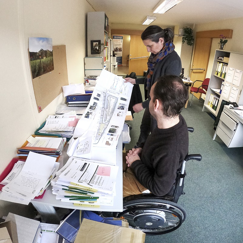 Ich selbst habe eine Muskeldystrophie, weshalb ich größtenteils den Rollstuhl auf weiteren Wegen und auf Arbeit nutze. Mein Auto ist nicht speziell angepasst. Es hat eine Automatik-Schaltung. Das reicht zu. Ich habe ein Ladesystem, um den Rollstuhl ein- und auszuladen. Außerdem nutze ich viel den ÖPNV. In der Stadt funktioniert das relativ gut.