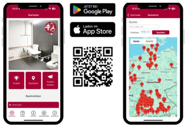 Die neue „Toiletten für alle“-App ist da! Die von der Stiftung Leben pur entwickelte Anwendung bietet eine zuverlässige digitale Orientierungshilfe für Menschen mit schweren und mehrfachen Behinderungen. Sie macht es möglich „Toiletten für alle“ unterwegs schnell und zuverlässig zu finden, sich über Projektneuigkeiten zu informieren und defekte oder neue Standorte zu melden. Die App ist einfach zu bedienen, inklusiv gestaltet, bundesweit nutzbar – und ab sofort kostenlos für iOS und Android erhältlich.